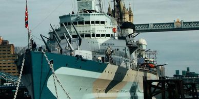WWII ship moored on Thames.